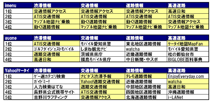 図3は、黄色地のサイトは渋滞情報が十分に扱われた、モバイル検索ユーザーのニーズを満たしている(ユーザーが望んだ情報が得られる)と考えられるサイトである。この表を見て分かるとおり、検索ユーザーの求めているサイトが必ずしも上位表示されているとは言えない。