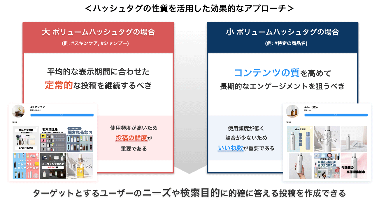 ハッシュタグを効果的に活用するには、そのキーワードの検索ボリュームの大きさに合わせ、検索結果の上位に表示される投稿の特徴を理解して戦略を立てることが大切です。