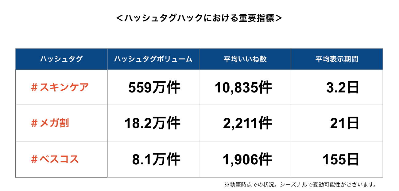 #シャンプー、#スキンケアのような「カテゴリー」を表すようなハッシュタグは、使用頻度が高く検索ボリュームが多いです。これらは競合が多いことから常に新しい投稿が上位に表示されます。これらのハッシュタグで上位表示させるには、そのハッシュタグごとによって異なる「投稿が上位に残って表示される平均的な期間」を予め確認し、それに合わせて定常的に投稿することが大切です。