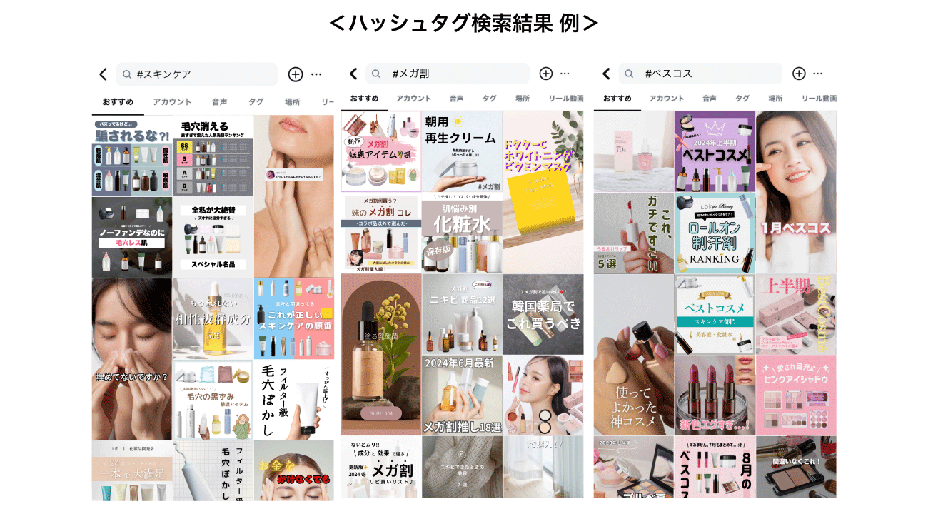 これらの例から明らかなように、#スキンケアでは「幅広い情報と比較」、#メガ割では「具体的なセール情報」、#ベスコスでは「信頼性の高い推奨情報」を求めていると推測が可能で、ハッシュタグのキーワードによって消費者の検索目的やニーズは大きく異なります。