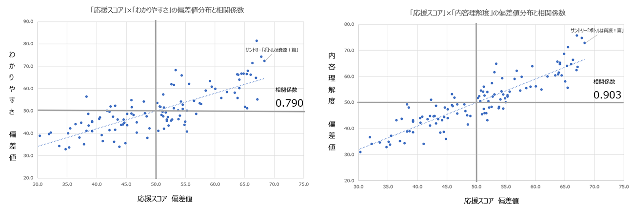 次の図5は、SDGs CM計115素材について、応援スコアと「わかりやすさ」「内容理解度」の偏差値を算出し、応援スコアと2項目の相関を示したものです。両項目ともに応援スコアとの相関が非常に高く、わかりやすいクリエイティブでメッセージを理解してもらうことが、その企業を応援したい気持ちにつながりやすいと言えます。