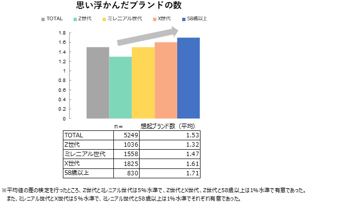 結果は以下の図の通り、Z世代やミレニアル世代よりもX世代や58歳以上の世代の方が、思い浮かぶブランドの平均件数が多い結果となりました。