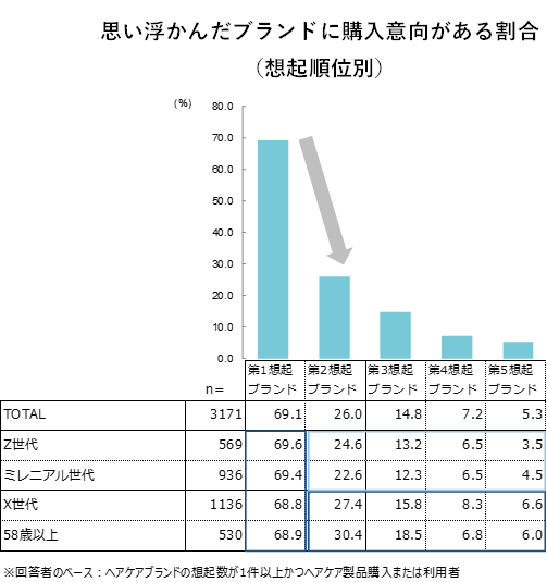 追加調査では、ある特定のカテゴリを提示した際に思い浮かぶブランドを回答してもらい、その平均回答件数を世代ごとに比較していきます。カテゴリは、性別と年代を問わず使用している人の割合が高い「ヘアケア製品」を採用し、ブランド名を自由記述形式で5件まで聴取します。