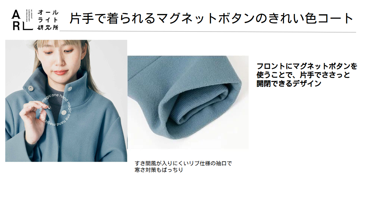 筧:片手で着られるコートやブラウス、レースアップシューズのほか、片手で出し入れできるバッグ、ネックカフやイヤーカフなどのアクセサリーを展開しています。このプロジェクトは「おしゃれ」にこだわったので、着脱しやすさはもちろん、色にもこだわりました。メインの企画を担当した下久保さん、詳しくお願いします。