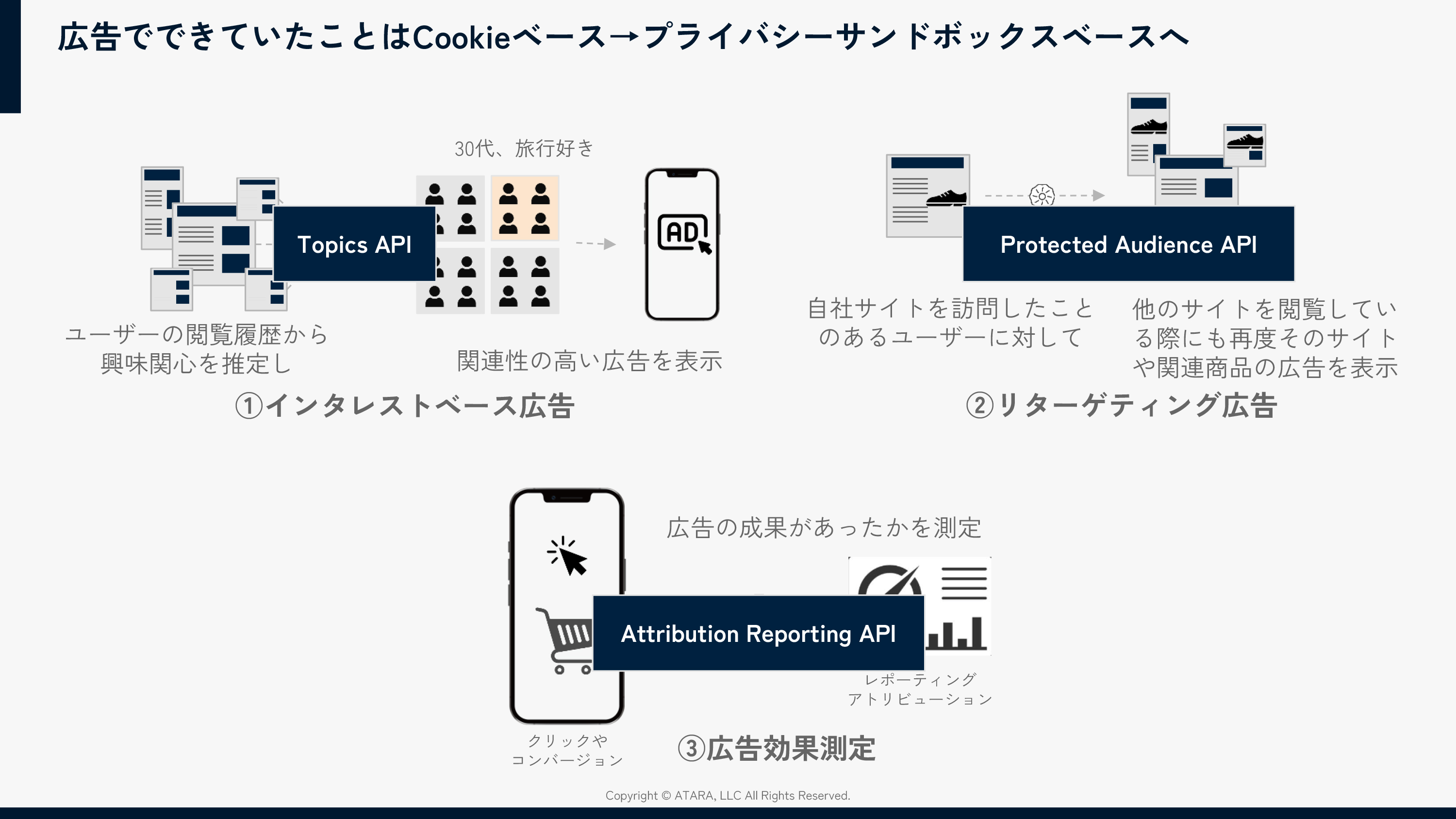 これまでGoogleがCookieに代わる仕組みとして準備を進めてきたのが「プライバシーサンドボックス」だ。従来、広告事業者のサーバー上でユーザーの閲覧履歴や属性情報などを収集・分析し、広告を配信していた。新しい仕組みでは、ブラウザ(Chrome)内でユーザーの興味や関心の対象を計算し、広告事業者には計算結果だけを伝える。事業者側に情報が保存されないため、プライバシーが保護される。Topics API・Protected Audience API・Attribution Reporting APIの3つのAPIが先述したインタレストベース広告、リターゲティング広告、広告効果測定の役割を担う(図1)。