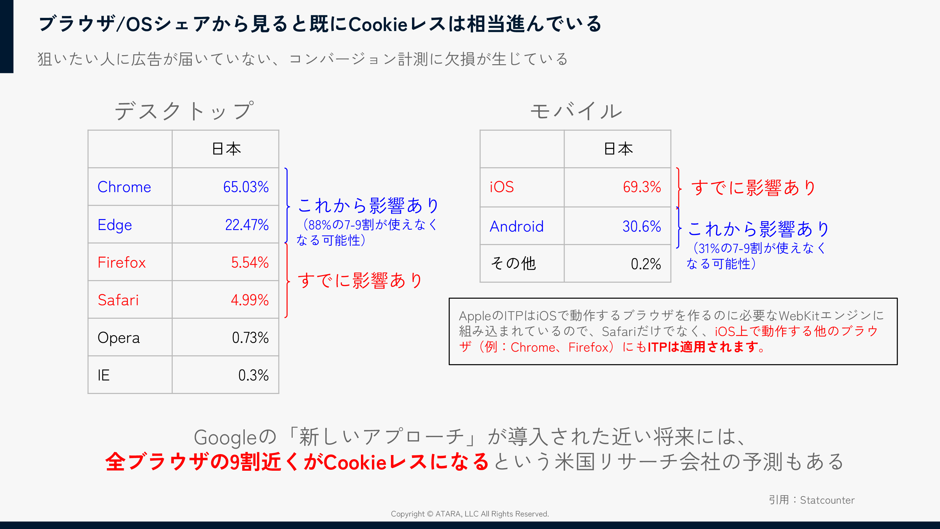 ユーザーがトラッキングの可否を判断するAppleのATT(App Tracking Transparency)におけるトラッキングの許諾率はグローバルで30%強、日本だと16~8%だ。Googleも類似の仕組みを導入するとしたら、8割~9割のCookieが使えなくなる可能性は非常に高い。