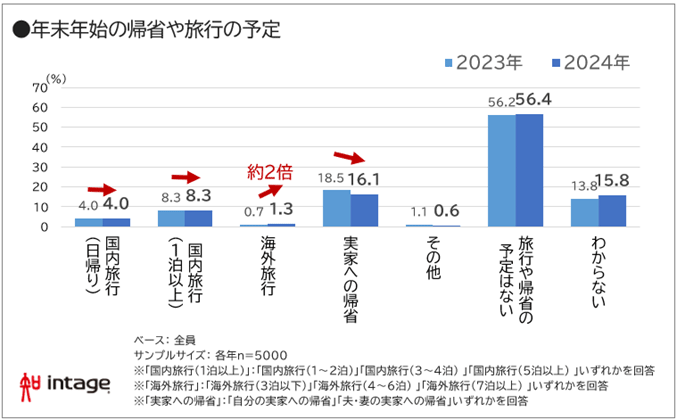まず、2024年の年末年始の予定を調べた。その結果、国内旅行と回答した人の割合は日帰り・1泊以上ともに2023年同程度に。予算も2023年は45,235円で2024年は46,401円と同水準となった。一方、海外旅行と回答した人は、割合自体は少ないものの2023年と比較して約2倍となった。