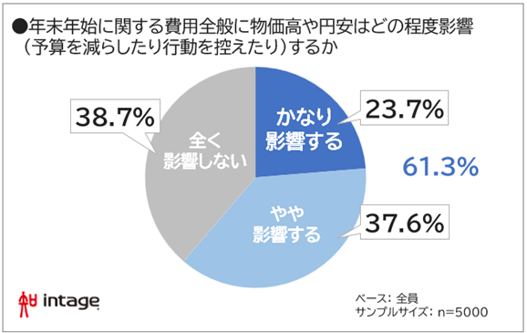 次に、物価高や円安に対する意識について調べた。「年末年始に関する費用全般」が「影響を受ける」と回答した人は、全体の61.3%にも上った。