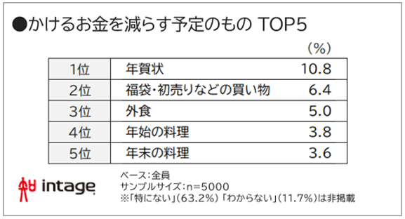 また、生活者がどのようにして費用を節約するのかを尋ねると、1位は「年賀状」で10.8%、2位は「福袋・初売りなどの買い物」で6.4%、3位は外食で5.0%となった。