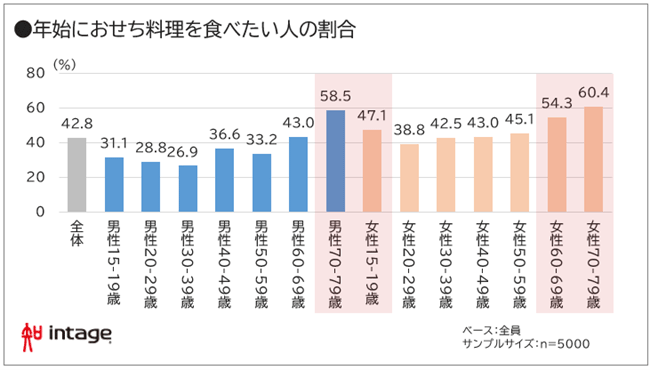 次に、年始に「おせち料理」おせち料理を食べたいと思う人の割合を調査。その結果、全体の4割強が食べたいと思うと回答した。しかし、年齢別でみていくと、男女ともに70代では約6割いるのに対し、男性の20代は特に低く、約3割となった。一方で、女性15~19歳では、47.1%と高い割合に。レトロブームの1つの表れと考えられるのだという。