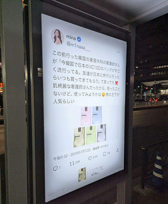 QUALITY 1stが2024年10月にバス停に掲出した「ダーマレーザー スーパーVC100マスク」の広告もXの投稿をそのまま用いた事例として話題になっていました。