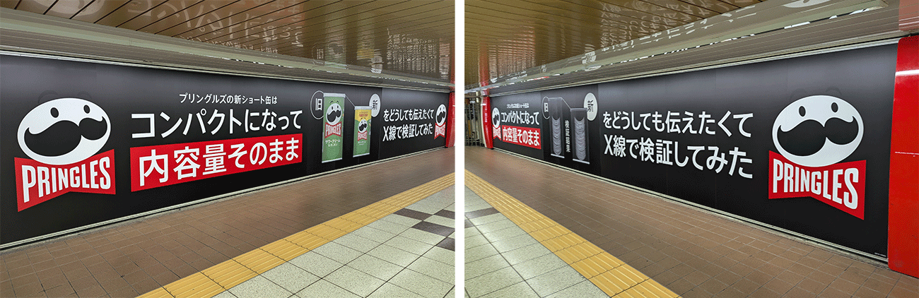 その事例の一つとして、日本ケロッグが2024年10月に新宿駅で展開した「プリングルズ」の広告が挙げられます。同広告では「容器がコンパクトになっても中身の量が変わらない」ことを訴求。ベローズプリントを活用し、片方から見ると容器のビジュアルに見える広告が、別確度から見るとX線を使った写真で容器の中身が見える仕掛けになっており、「内容量が変わらないこと」を視覚的に表現していました。