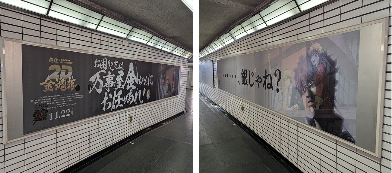 他にも2024年11月に新宿駅で展開された「銀魂オンシアター2D 金魂篇」の広告でもベローズプリントが活用されていました。同広告では、作品名の“銀”魂にちなんで「万事屋“金”ちゃん」の部分にツッコミを入れるビジュアルに。作品が持つ雰囲気や温度感をうまく表現している広告となっていました。
