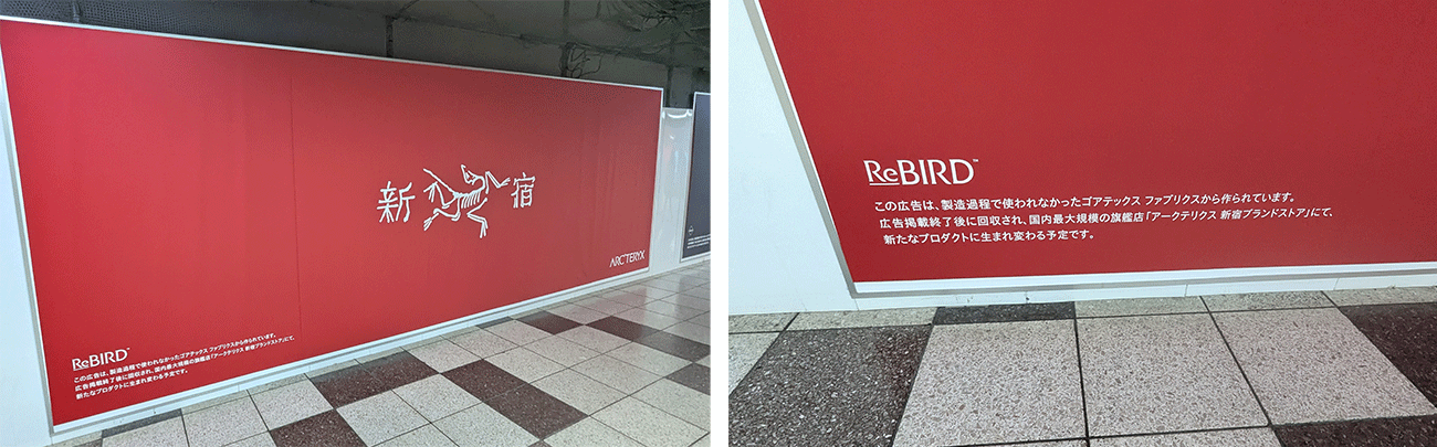 広告の左下には、「広告掲載終了後に回収され、国内最大規模の旗艦店『アークテリクス 新宿ブランドストア』にて、新たなプロダクトに生まれ変わる予定です。」との記載が見られた