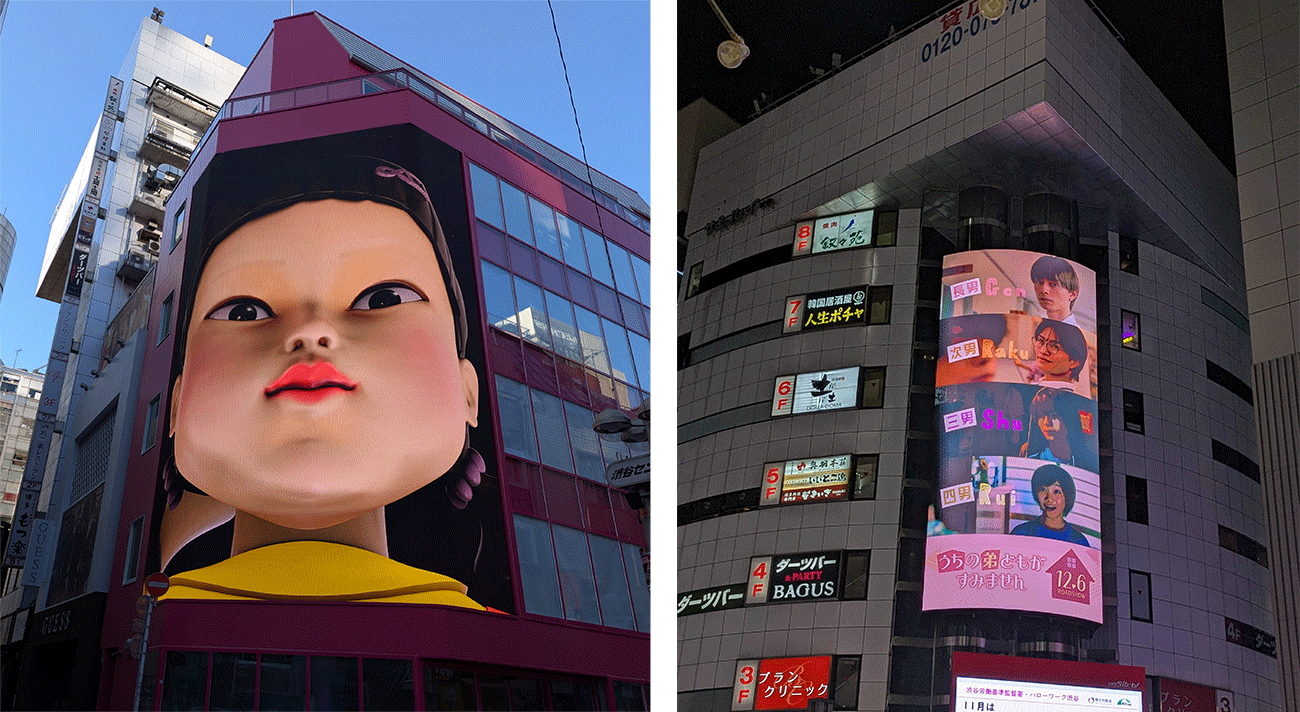 (左)2024年12月から稼働を開始した「渋谷センター街ヒットビジョン」、