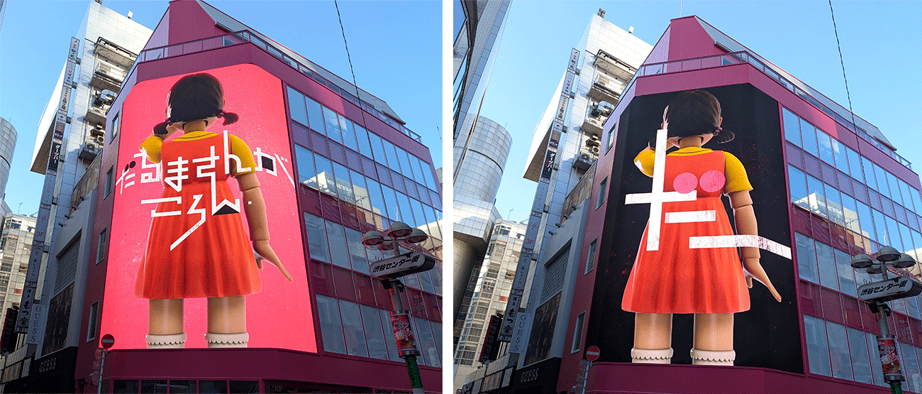 実際、縦長ビジョンの進出によりクリエイティブ面での可能性も広がっています。渋谷センター街ヒットビジョンで2024年12月に展開されたNetflixシリーズ「イカゲーム」シーズン2の広告では、作中に出てくる“かくれんぼ”が体感できる演出に。人物などを実寸大以上で表示したことで、強いインパクトを与えることに成功していました。