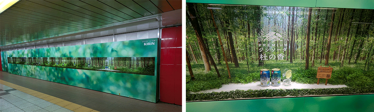 続いて紹介するのは、キリンが2024年11月に新宿駅で実施した「KIRIN Premium ジンソーダ 杜の香」の広告です。