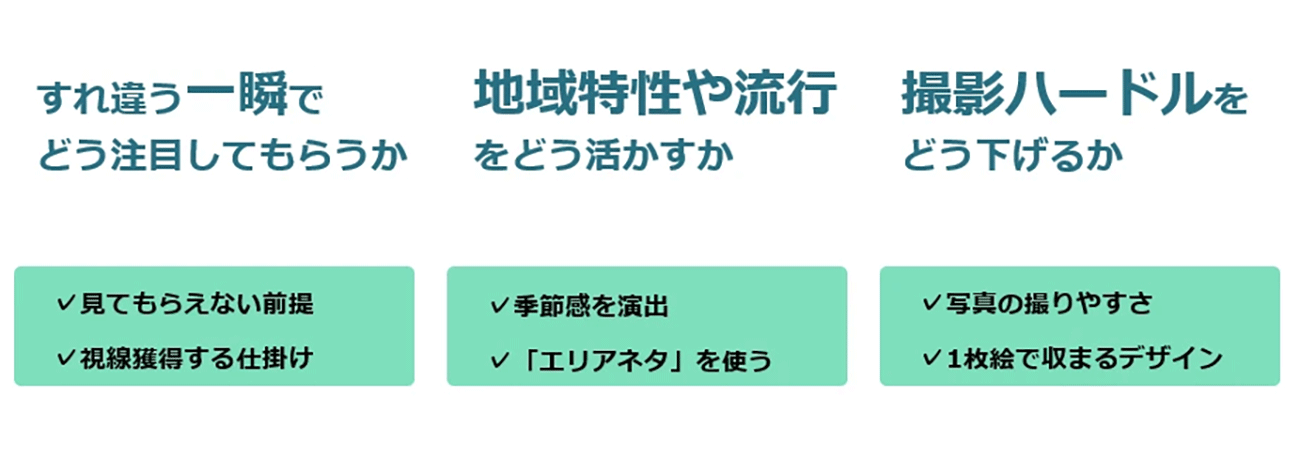 三つ目は「撮影ハードルをどう下げるか」という視点です。これは先述の通り、話題化させる上で非常に重要だと言えます。どんなに素晴らしい広告を掲出できても、写真に収めにくければSNSでの投稿・拡散は期待できないからです。