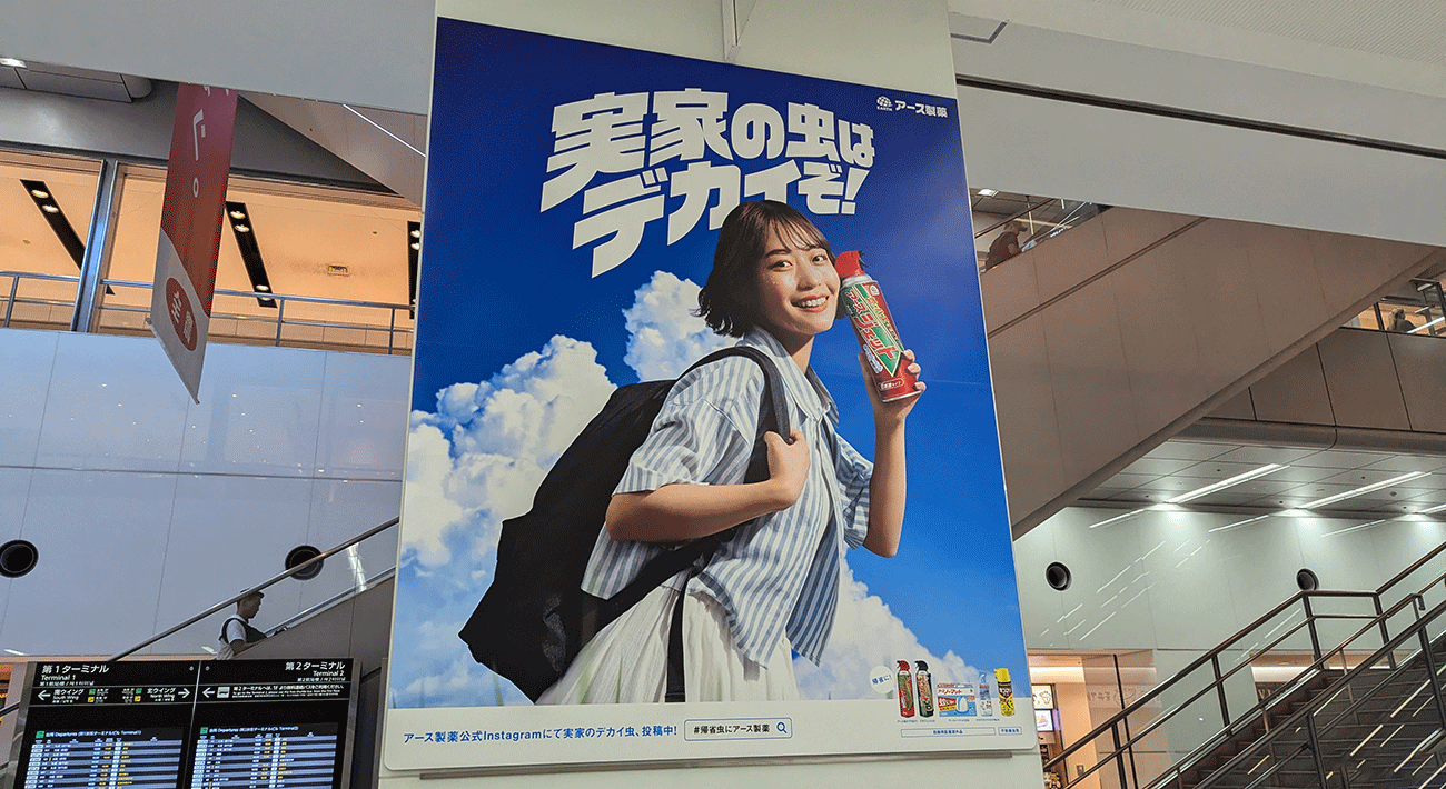 この要素を上手く取り入れたのが、以前記事の中で紹介した、アース製薬が2024年8月に羽田空港第1ターミナル(国内線)の入口近くで展開した「アースジェット」と「ゴキジェット」の広告です。