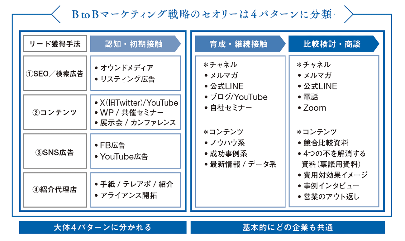 顧客との接点は、「SEO・検索広告」「コンテンツ」「SNS広告」「紹介・代理店」の四つに分類できます。逆に、顧客との接点を作った後(リード獲得をした後)は、図にある通り、どの企業も基本的には共通した施策を実施します。