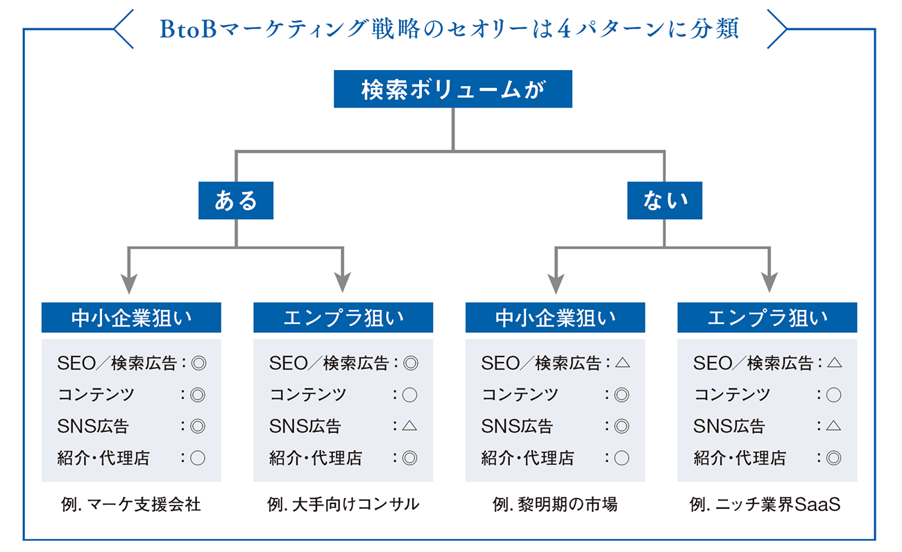 まずは自社商材の関連キーワードにおける検索ボリュームの「ある」「なし」で分岐します。その理由は、BtoBにおいて情報収集の主流は今でもやはり「Googleの検索」であるからです。検索が使えるかどうかがマーケ施策の分かれ目となります。