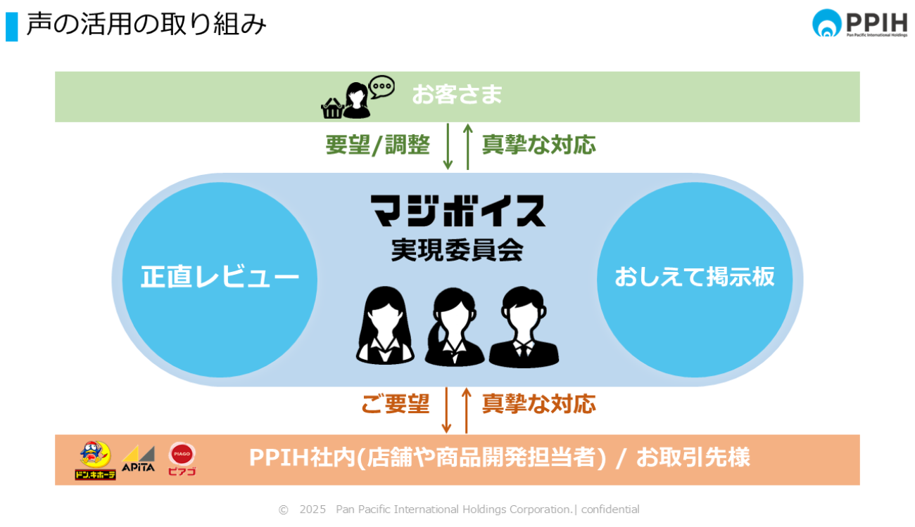 続いては、具体的な声の活用について紹介がなされた。商品の改善に向けて、同社では「マジボイス実現委員会」を立ち上げている。委員会の担当者が顧客の声をキャッチし、顧客と商品開発担当者、店舗のハブとなることで改善につなげる組織だ。