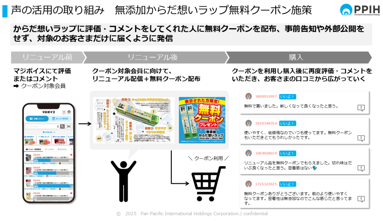 またリニューアル後に、改善に活かすことができたお礼として声を投稿した顧客に事前告知なしで新商品が試せる無料クーポンを配布した。クーポンをきっかけに新商品を手に取る顧客も多く、「新商品が使えて嬉しかった」「本当に切りやすくなった」「箱が頑丈になった」などポジティブな声が一層自発的に上がった。