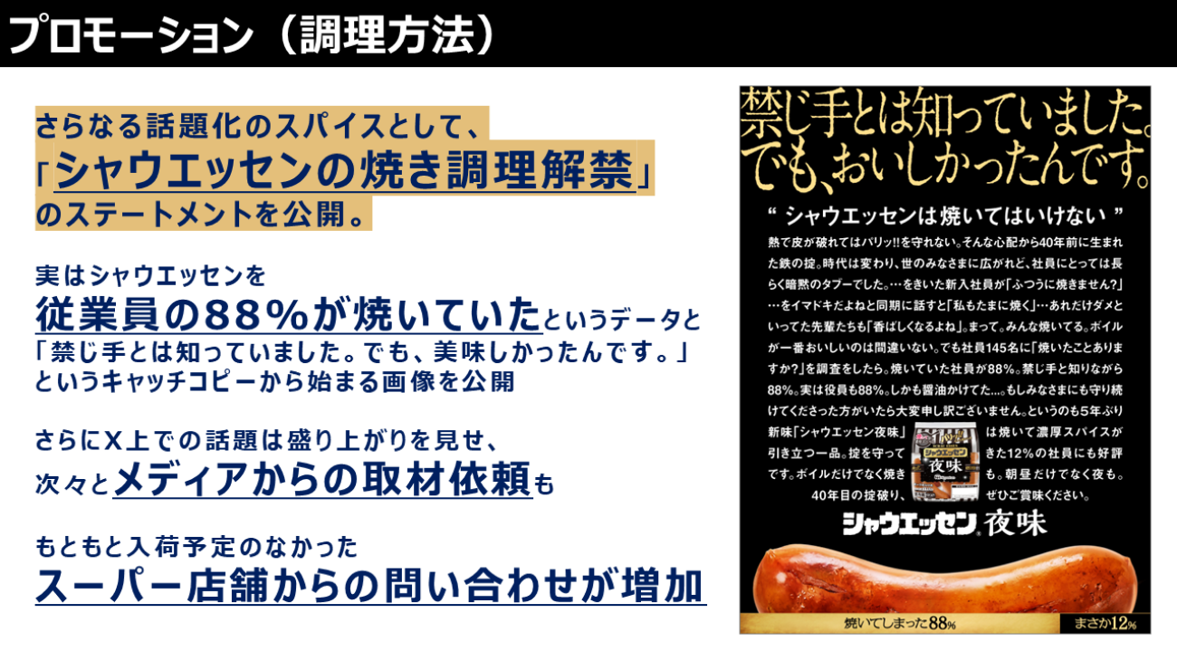 ところが、シャウエッセンの食べ方について社内アンケートを採ってみたところ、なんと88%の従業員が「焼いたことがある」と判明した。岡村氏らは驚いた一方、「この事実をプロモーションに盛り込んだらおもしろくなるのでは」と考えた。