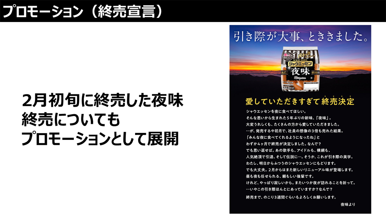 「夜味」は4ヵ月間の期間限定商品だったが、終売の際も戦略的なプロモーションを展開し、さらなる話題を創出した。具体的には、終売の半月前に、Xに「引き際が大事、とききました。」から始まるステートメントを投稿した。