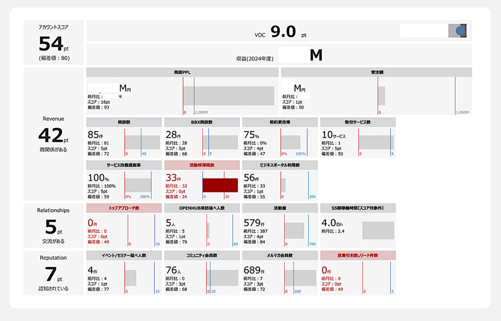 スコアは、重要KPIである3つのR=Revenue(売上)、Relationship(関係性)、Reputation(評価)と連動している。たとえば、今の売上が良ければ高いスコアになるわけではない。中長期的な新しい取り組みが動いていなければRelationshipで評価されず、結果的にスコアは低くなるという具合だ。