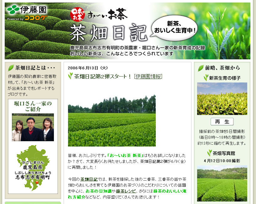 伊藤園の「お~いお茶 茶畑日記」というブログでは、製品であるお茶ができるまでを動画で紹介したり、産地や製法、生産に携わる人の様子を写真や動画を駆使して、映像と音声の両方の情報を伝えてくれています。