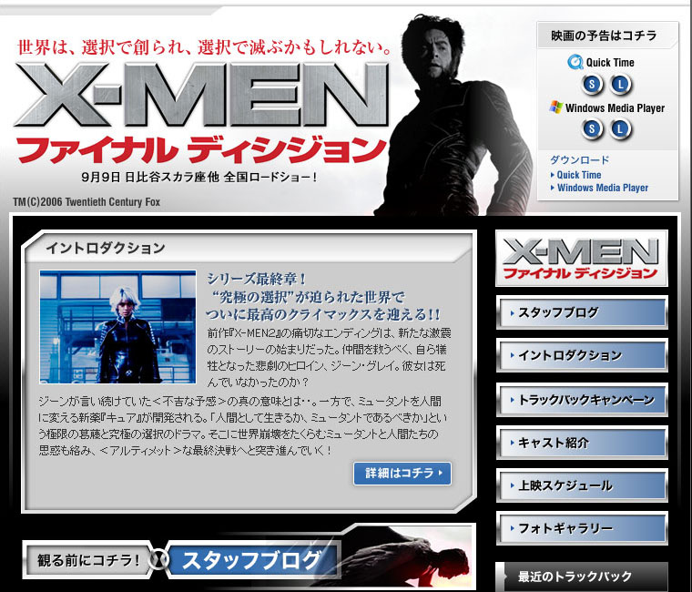 映画「X-MEN:ファイナルディシジョン」のブログでは、映画の告知はもちろんのこと、封切り前のイベント情報の掲載などにブログを活用しています。ブログを利用することで、更新管理の効率化はもちろん、クチコミを促進するのにも一役かっているようです。