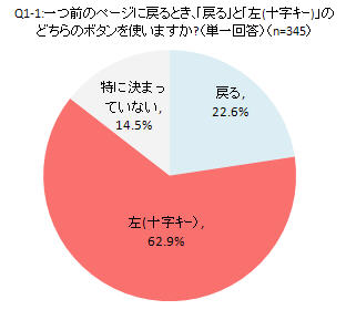 Q1では、携帯電話で1つ前のページに戻る際、「戻る(ブラウザー上の戻る)」と「左(十字キー)」のどちらを利用するか尋ねた。その結果、「左(十字キー)」と回答したユーザーの方が多く、半数を上回る62.9%となった。「戻る」と回答したユーザーは22.6%、そして「特に決まっていない」が14.5%となった。