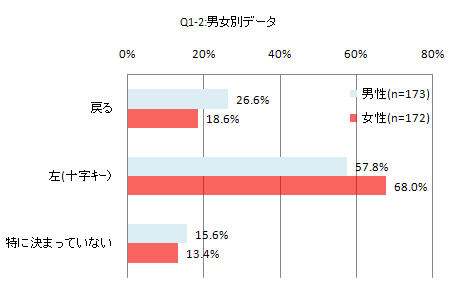 また、この結果を男女別に比較すると、男性は「戻る」を使う割合が8ポイント高く、逆に女性は「左」と回答した割合が10.2ポイント高いことがわかった。