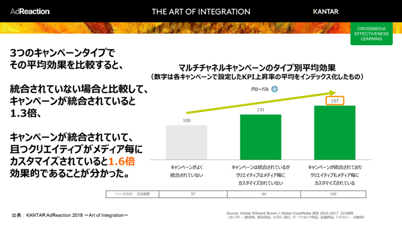 第3の条件について、複数メディアでのキャンペーン展開を3パターンで調査した結果、バラバラな素材を使った場合を100とすると、同一素材の横展開で130%、さらにキャンペーンを統合した上で、メディアごとにクリエイティブのカスタマイズを行うと160%近い効果を生むことが判明したという。