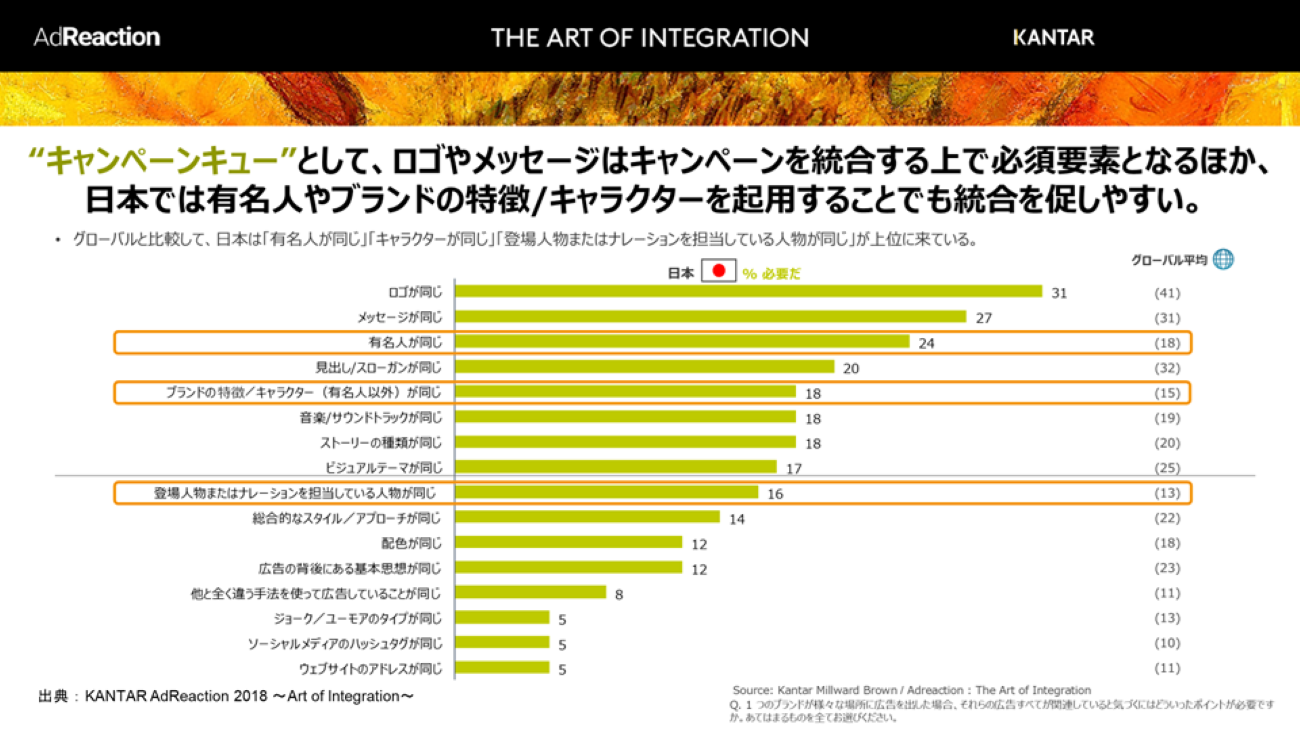 1つ目は、同じキャンペーンだと気づかせるための「キャンペーンキュー」を広告素材に7つ以上盛り込むこと。キャンペーンキューには、ロゴやメッセージのほか、日本では有名人やブランドの特徴、キャラクターを起用することでもキャンペーンの統合を促しやすく、そのキューに触れることでキャンペーンの世界観が思い起こされ、媒体をまたいでいても同じキャンペーンであることが消費者に伝わりやすくなる。