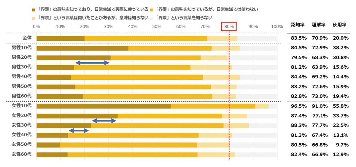 調査結果では、男性20代を除いてどの性年代でも「『界隈』という言葉を聞いたことがある」=認知率は8割を超えており、「意味を知っている」=理解率も7割前後と、「界隈」という言葉が大衆化していることがわかります。