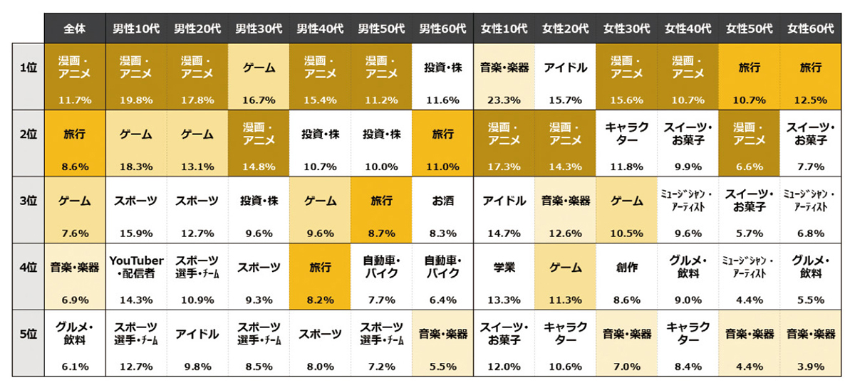 全体で見るとTOP3は「漫画・アニメ(11.7%)」「旅行(8.6%)」「ゲーム(ソーシャルゲーム・eスポーツなど)(7.6%)」で、「音楽(K-POP・クラシック・ボーカロイドなど)・楽器(6.9%)」が続きます。