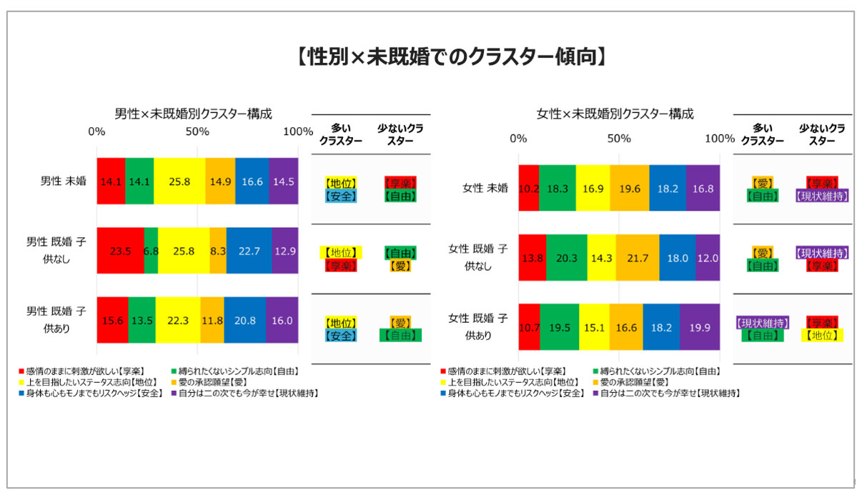 前述のとおり、この6クラスターは性年代のメリハリがついています。大きく分けると【享楽】【自由】【安全】の各クラスターがシニア寄り、【地位】と【愛情】クラスターが若者寄り、【現状維持】クラスターは30~40代が多くなっています(図10)。