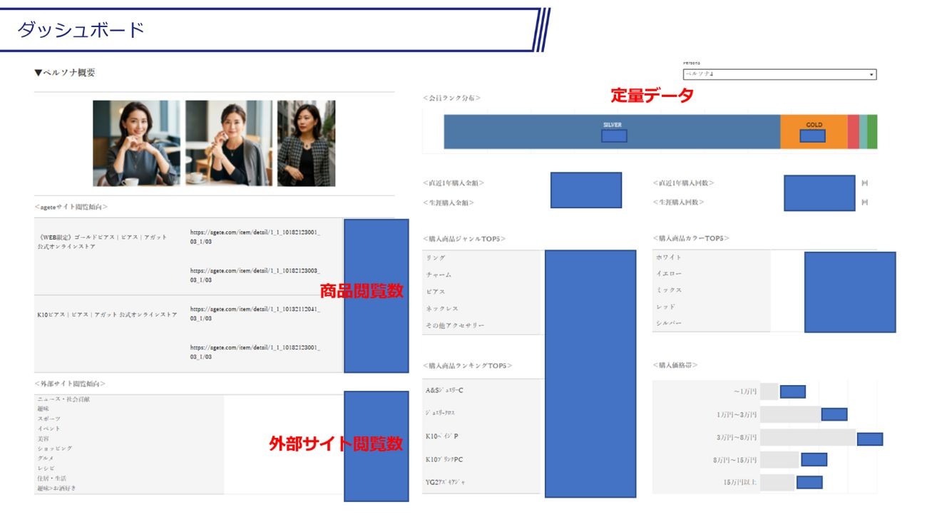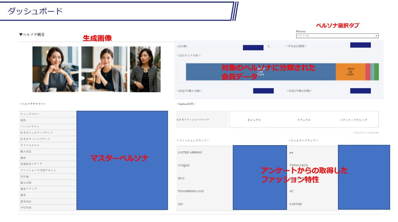 完成したダッシュボードには、AIが生成したユーザーのイメージ写真とともに、「『華やかフェミニン、高級好き』」といったキャッチコピーや、好きなファッションブランド、趣味、職業といった詳細なペルソナ情報が並ぶ。さらに、そのペルソナに紐づく実際の顧客群の平均購入額や閲覧商品といった定量データも瞬時に確認できる。