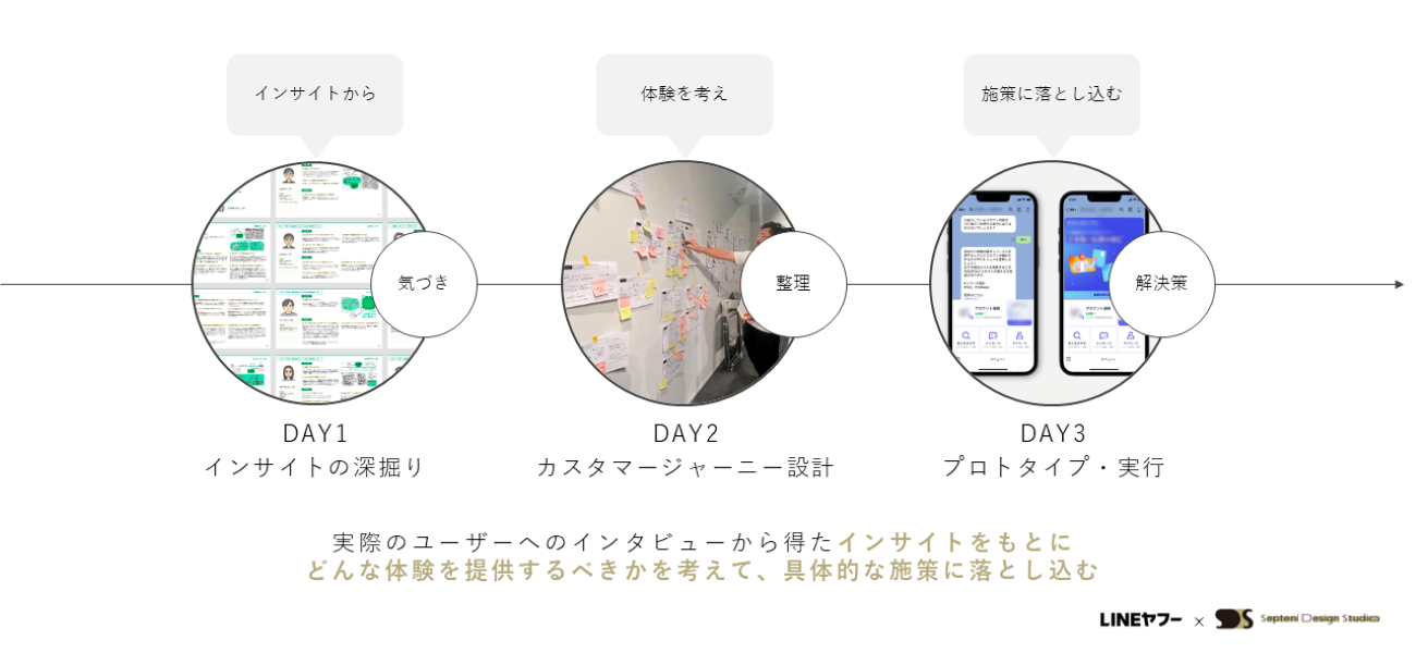 DAY1では、LINE公式アカウントでできる最新機能や体験を理解した上でユーザーのインサイトを深掘りしました。そして、DAY2ではカスタマージャーニーを設計、DAY3では、仮説を基にコンセプトを作成し、具体的な施策案を検討しました。