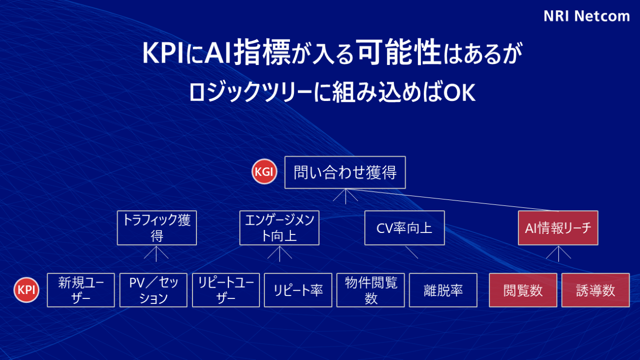 「一般的には、KPIはロジックツリーで考えます。KGIを達成する上での成功要因を抽出。その成功要因を計測可能な指標をKPIとして設定します。今後、AIに関わる計測指標が入る可能性があるでしょう。たとえば、AI情報でのリーチ数と、それにまつわる閲覧数・誘導数といった指標です。その場合にもロジックツリーに組み込みます」(時津氏)