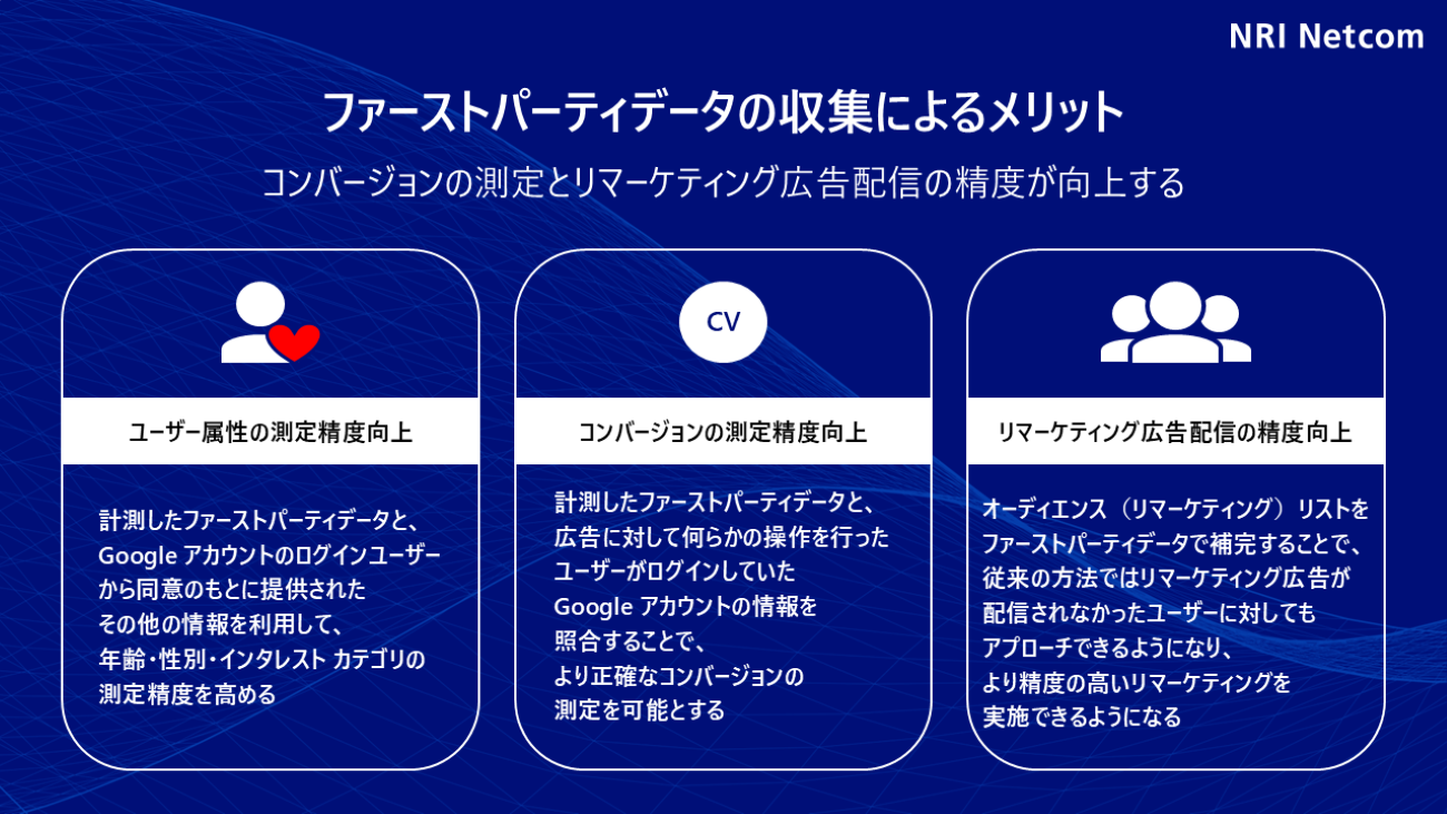 「1st Partyデータを取得することで、ユーザー属性の測定精度向上、コンバージョンの測定精度向上、リマーケティング広告配信の精度向上という3つの効果が期待できます」(神崎氏)