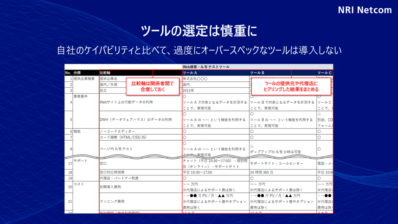 「特に、3番は非常に重要です。高機能なツールを導入しても、自社の体制でうまく回せずただコストだけが過剰にかかることは、非常によくあるケースです。自社のケイパビリティと比べて、オーバースペックなツールは導入しないほうがいいですね」(神崎氏)