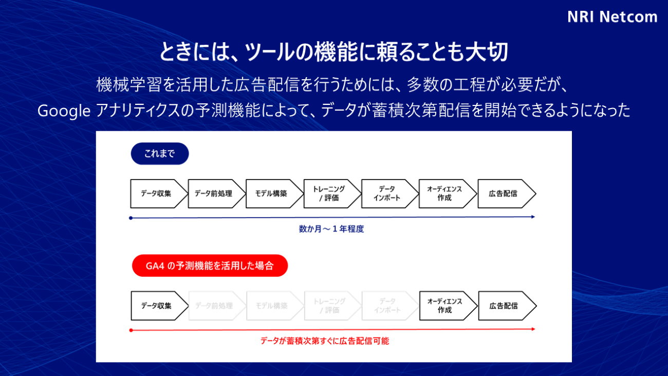神崎氏は「Google アナリティクスには機械学習を活用した予測機能が実装されています。『7日以内に離脱する可能性が高いユーザー』や『向こう7日間に商品を購入する可能性が高い既存顧客』といった『予測オーディエンス』を作れば、データの蓄積次第で広告を配信できます」と話す。