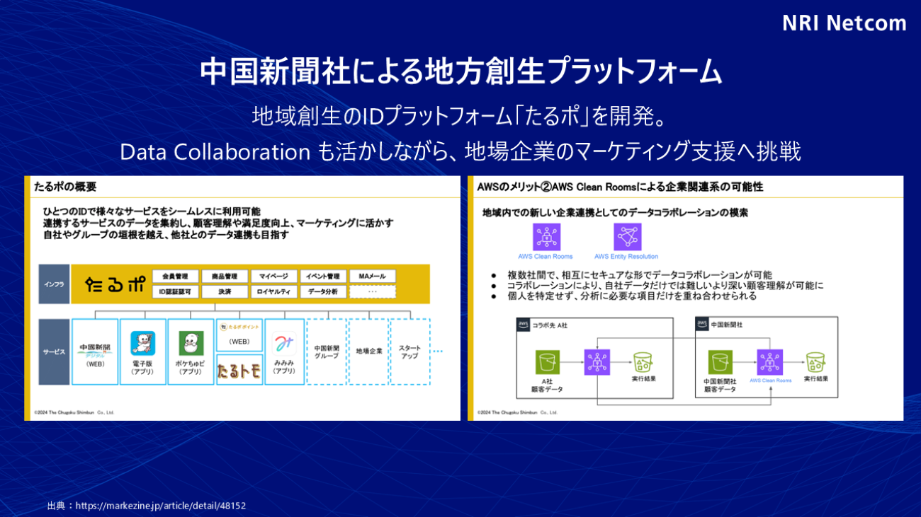 さらに、AWS Clean Roomsを活用し自社のデータと外部のデータを組み合わせる、先進的な取り組み例として、中国新聞社による地域創生プラットフォームを紹介した。