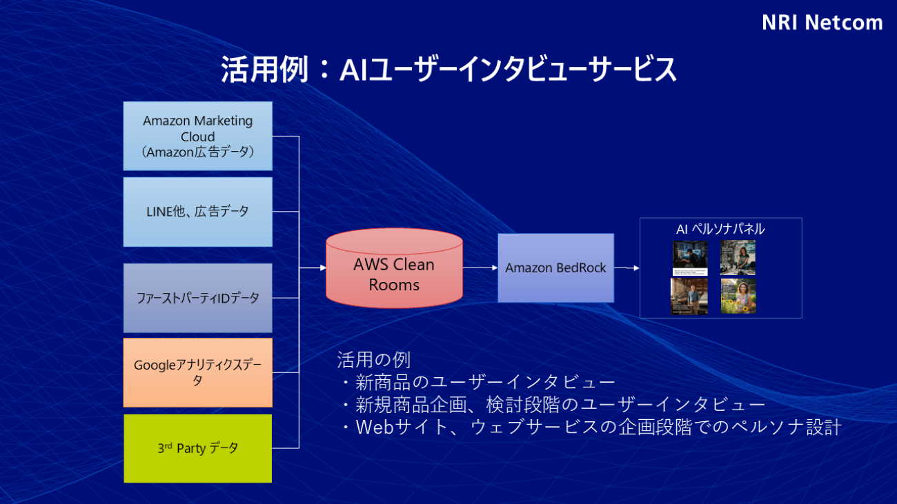 また、NRIネットコムが発展的な活用方法として検証を進めているのが「AIユーザーインタビューサービス」だ。自社の広告データ、1st Partyデータ、Google アナリティクスのデータ、3rd PartyデータをAWS Clean Rooms上でコラボレーションすることで、ユーザーのペルソナを作成。その仮想ペルソナに対し、生成AIを活用してユーザーインタビューを実施するというものだ。