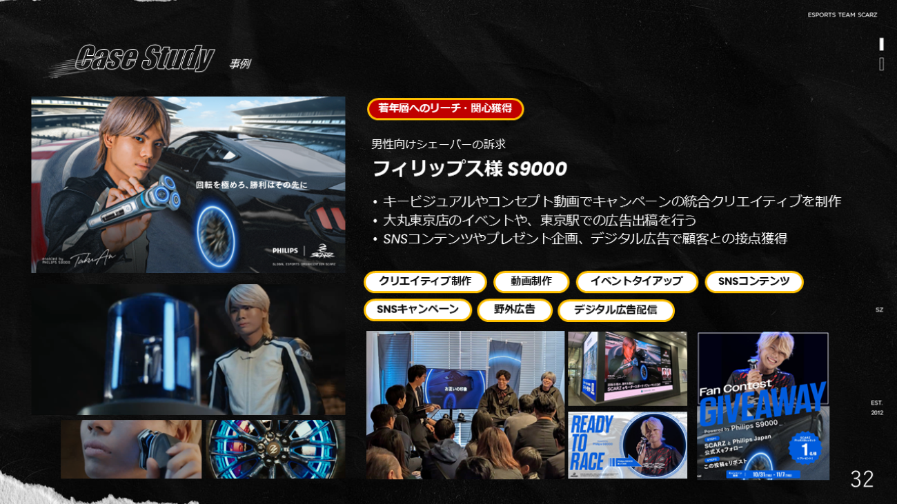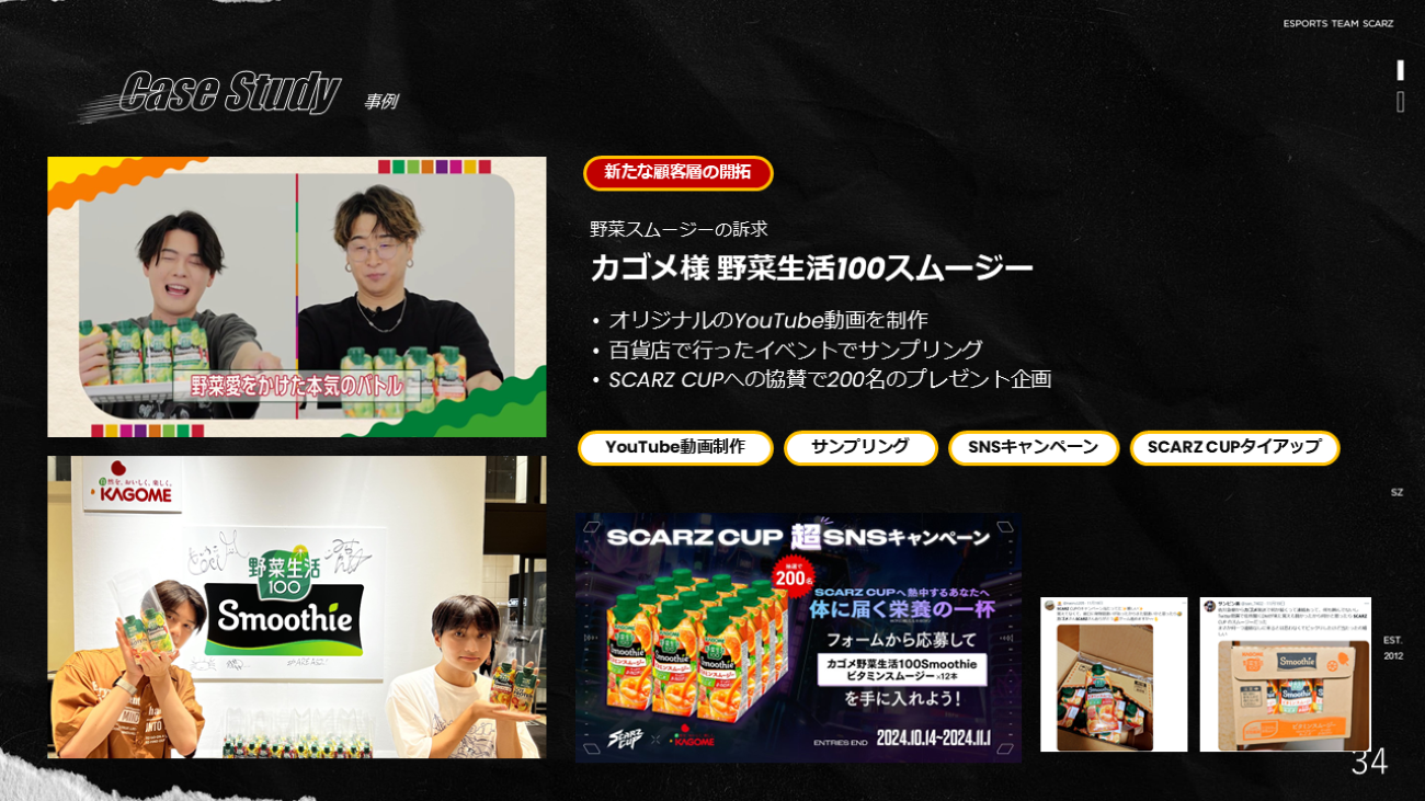 オリジナルのYouTube動画制作では、SCARZの選手が出演し、ゲームやeスポーツに携わる人が健康で健やかに過ごしてほしいというメッセージを発信した。次に百貨店で行ったイベントでのサンプリング。リアルの場でeスポーツやゲームファンに直接製品を届けることで、ブランド体験を創出した。第三にSCARZ CUPへの協賛で200名へのプレゼント企画を実施した。