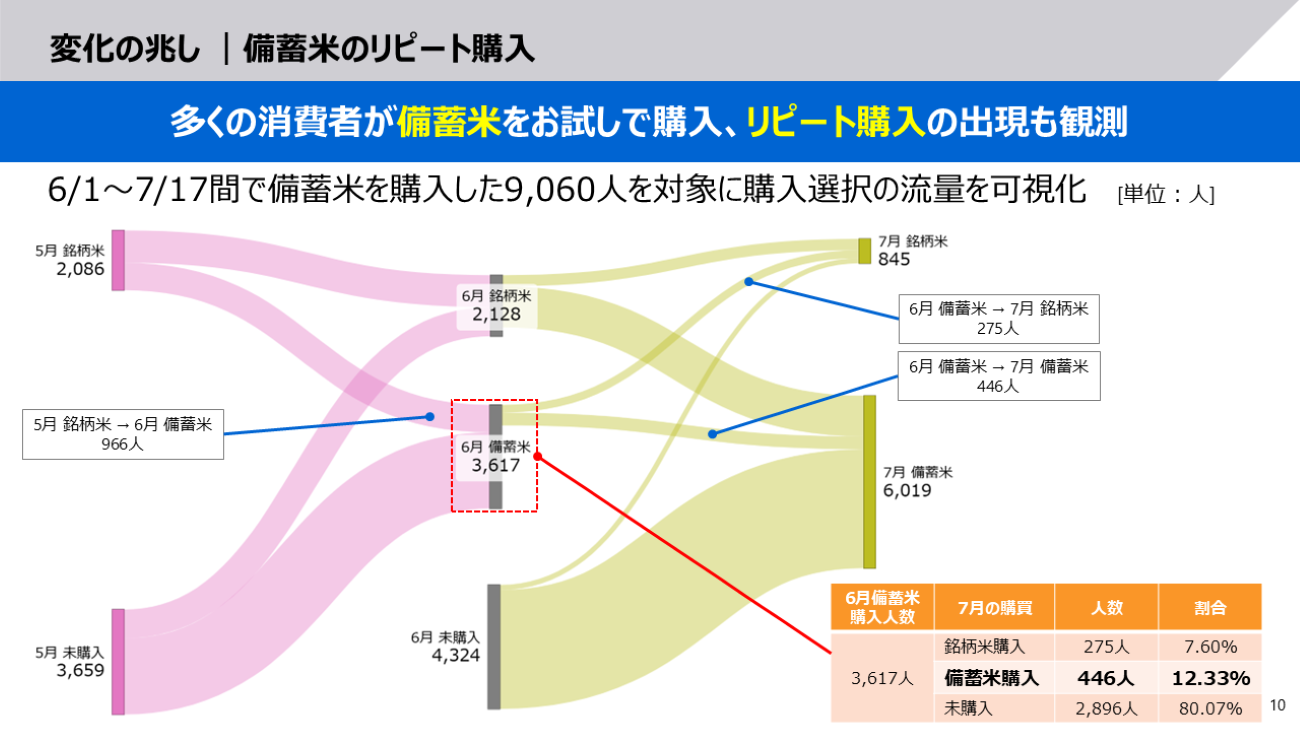 さらに、備蓄米購入者の購買傾向も分析したところ、銘柄米(ブランド米)を買っていた人のうち半数近くが翌月は備蓄米を購入。そのうち約6割がさらに翌月も備蓄米をリピート購入していることがデータからわかった。