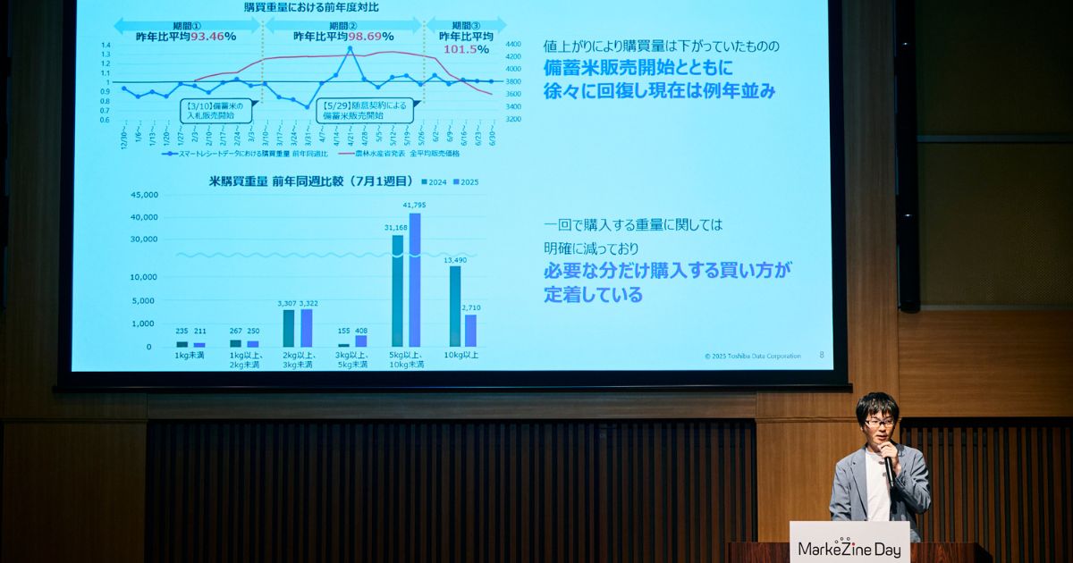 もう1つが急騰したコメ価格と、それに対する購買行動の変化だ。宮崎氏は「平常時の1.5倍程度の価格になった2025年の初めから春頃にかけて、需要は前年比で6.5ポイントほど下降傾向でした。しかし、その後備蓄米の放出によって例年通りに回復しました。一方で1回に購入する重量は顕著に変化し、10kg以上の大容量より少量を必要に応じて購入することが定着しています」と解説した。